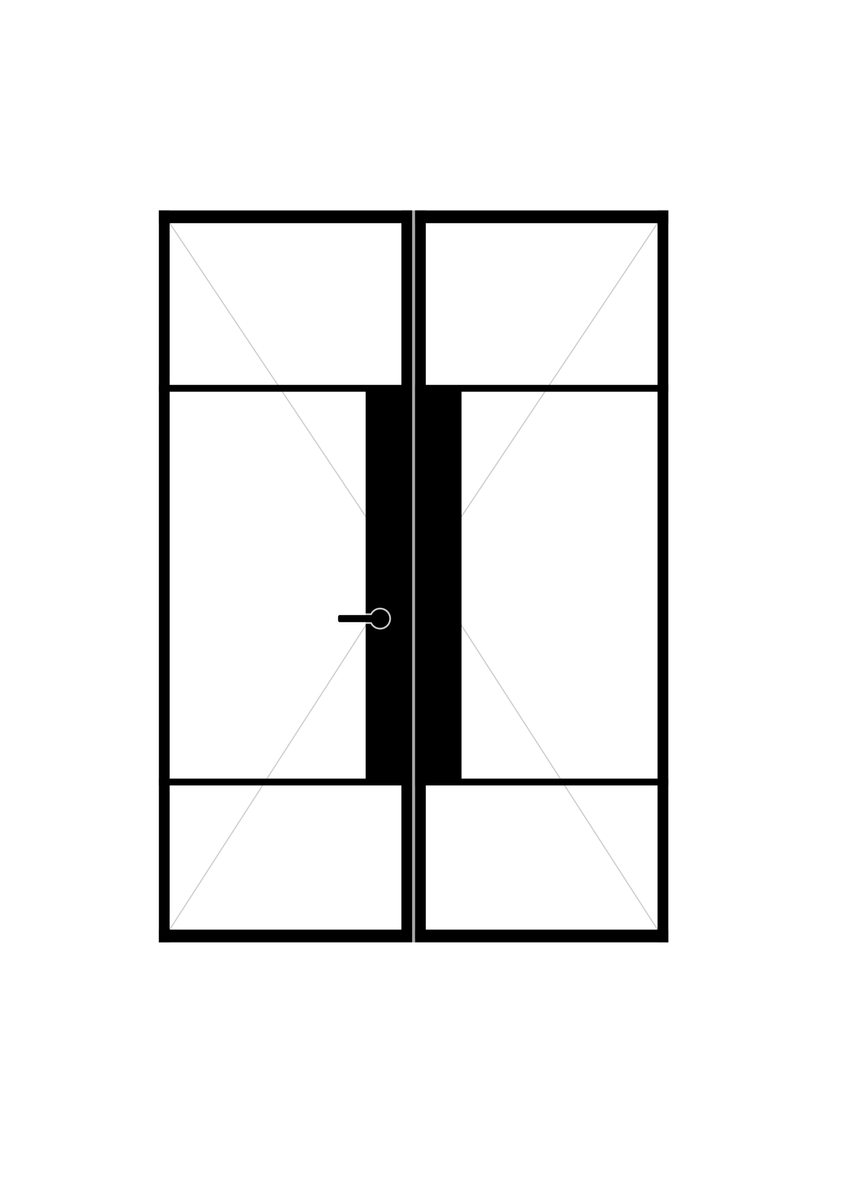 Dubbele Scharnierdeur Aluminium 3 vaks-oneven, inclusief veiligheidsbeglazing (type 44.2). Vakverdeling: 1 glasvak breed, 3 assymetrische vakken hoog